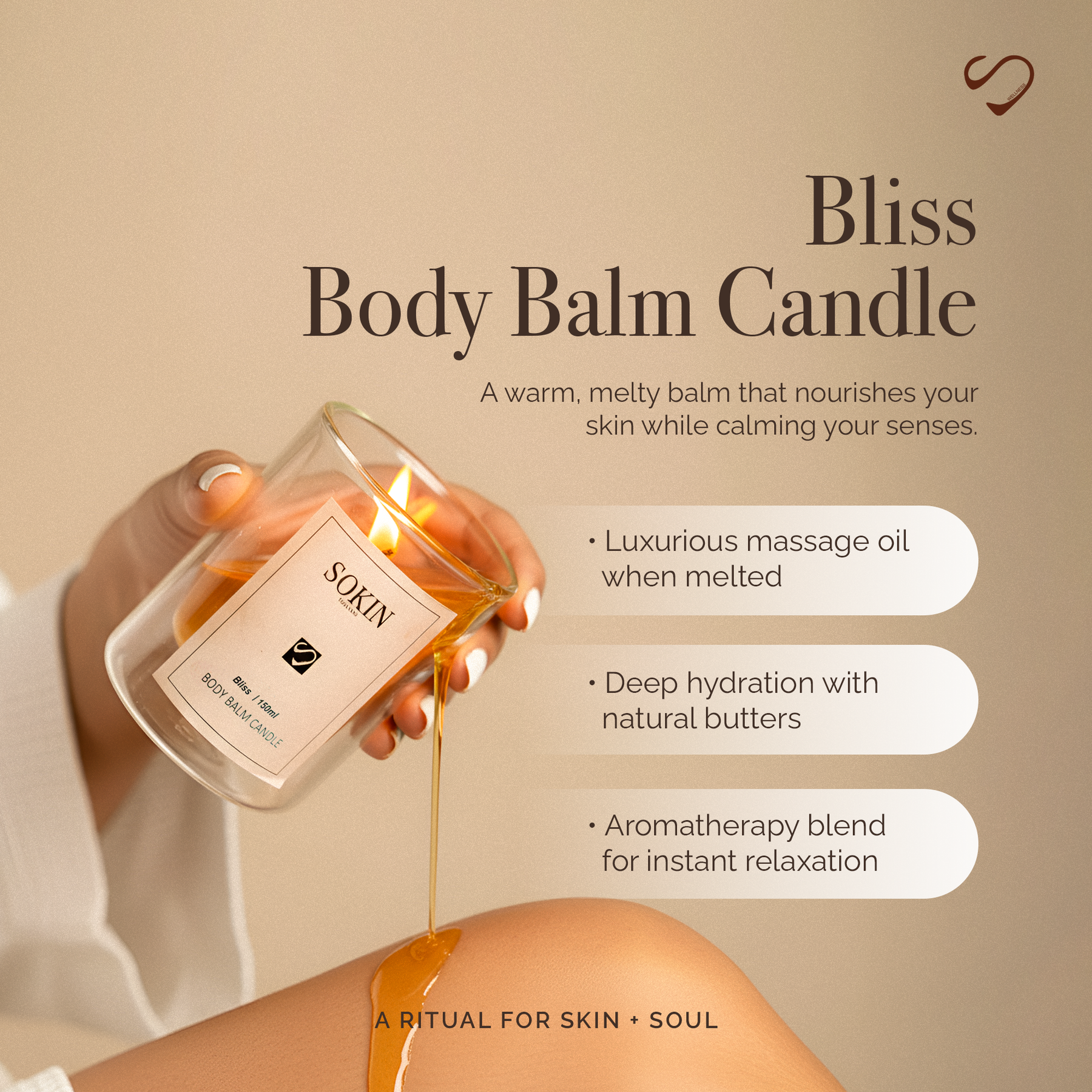 A warm body balm candle melting into a lightweight serum that calms dry, sensitive skin and restless energy—rooted in Ayurveda.